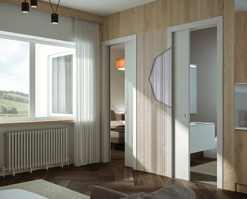 Dos hojas opuestas se deslizan dentro de un único premarco central con estructura de Aluzinc®, material que hace que el premarco sea especialmente resistente a la corrosión. Pratico es la solución ideal para las estancias contiguas que no disponen de espacio suficiente para instalar dos premarcos. Reduce el espacio ocupado, adecuado para paredes de obra.